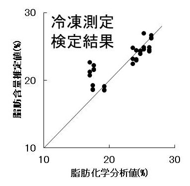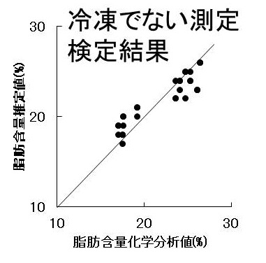 冷凍状態でない魚は測定ヘッドが魚肉に密着するので表面での光散乱が少なく測定しやすいと考えられます。逆に冷凍状態では測定面が硬いので、測定ヘッドが密着せず多くの表面散乱光が観察されます。この表面散乱光は測定の邪魔をします。したがって冷凍状態でないほうが精度良く測定できますが、生産の現場では冷凍状態での測定が必要な場合があります。今回は両者の測定結果を掲載しました。下に示した2つの散布図が結果です。全体的に見て両者とも想定した測定精度よりもやや低い結果ですが、筋肉側(内部側)から測定したことが原因と考えられます。