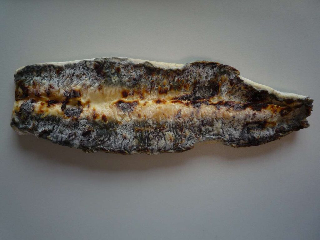 まず、皮側と肉側のどちらで測定するかを考えます。一般的に魚の脂の乗り具合は、皮のすぐ裏側で多く蓄積されるので通常は皮側から測定を行います(完全非破壊測定)。しかし、白焼きの皮側は写真1に示したように、黒く焼け焦げた部分が広く散在している状態であり、スペクトル測定(光学測定)には、測定試料の黒色は光が反射しないので苦手です。したがって、今回は写真2,3のようにウナギを開いた肉側部分での測定としました。