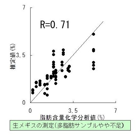 メギス(ニギス)は、キスに似た外見を持つ深海魚です。身が柔らかく脂がのって旨味があり、フライ、天ぷら、煮付け、干物、汁物など様々な料理で楽しまれる大衆魚です。しかし、時期により脂ののり具合が大きく異なるようです。今回は脂肪含量が3%以下の魚体が多く、脂肪の多いサンプル(10%前後)が入手できなかったので、偏ったサンプルでの測定結果になります。今後、多脂肪魚の測定結果を追加して解析を行えば脂肪の多寡を判別できる検量線が提供できると思われます。なお、脂肪含量化学分析値は可食部全体から求めています。
