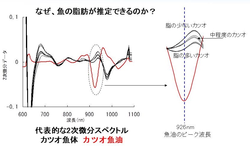 カツオ魚肉から化学的に抽出精製した魚油を測定した結果をグラフ中の赤線で示してあります。2次微分スペクトルとは、オリジナルの測定データを一定のルールで変換して見やすくしたものです。下方向(マイナス方向)に下がるほど吸収が強く現れていると見てください。魚油のスペクトルでは926nmにおいて強い吸収があることがわかります。これは、油脂(植物脂など)の文献値とも一致しますので、魚油特有の吸収ではなく一般的な油の吸収と考えられます。