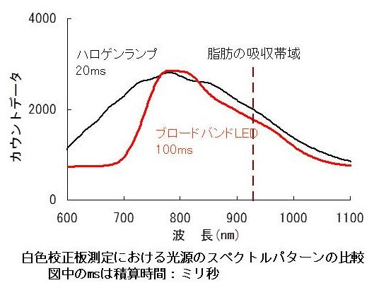 BBLEDを搭載した小型分光測定器は、従来のハロゲンランプを搭載した測定器よりも要求する電源電圧および容量が小さく、測定器のサイズが小型化されました。白色樹脂を白色校正板として、BBLED光源の感度特性を観察した結果、ピーク波長は770nm、有効波長はおよそ700-1100nmであり、脂肪の吸収波長である930nm付近を十分にカバーしていました。また、ハロゲン20msの受光感度を標準とすると、BBLED光源をハロゲン光源の感度まで高めるには100msの積算時間を必要としました。