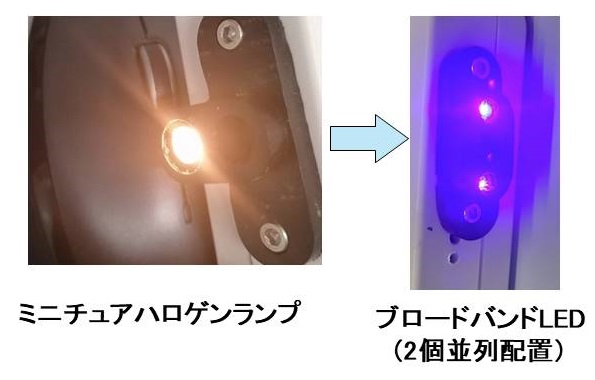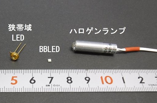 近年では、小型分光測定器に光源として搭載するミニチュアハロゲンランプの生産が急減しています。そこで、ハロゲンランプのかわりに新たな光源として、ブロードバンドLED(BBLED) を用いる小型測定器を試作してみました。BBLEDは、脂肪の吸収バンドである926nmの帯域をカバーしているSFH4737(VF=2.9V、OSRAM、 Germany)を用いました。今回用いたBBLEDは、サイズが1.5×1.5×1mmと極めて小型であるため、2個並列で装備しました。